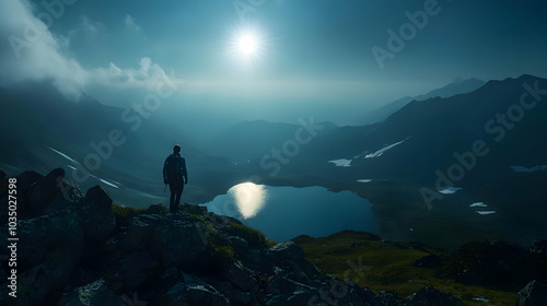 A Lone Hiker Contemplates the Mountain Lake, Reaching the Summit with Determination and Resilience