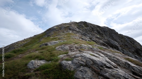 mountain, peak, summit, slope, hillside, terrain, nature, wild, natural, landscape, geology, rock, stone, earth, ground, vegetation, grass, green, grey, blue, sky, cloud, atmosphere, elevation, altitude, person, hiker, explorer, silhouette, remote, serene, tranquil, adventure, journey, ascent, height, viewpoint, scenic, huge, rugged, infused, texture, uneven, distant, achievement, freedom, challenge, solitude