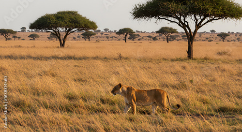 A lone lioness walks through the tall golden grass of the African savanna at sunrise.