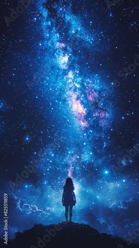 A lone person gazes upward at the mesmerizing expanse of the star-filled night sky A woman standing on a hill looking at the stars.