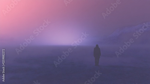 A lone solitary figure silhouetted against a mystical misty landscape with a dramatic moody atmosphere The hiker ventures forth into the unknown exploring the serenity and tranquility of the remote