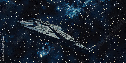 A lone spaceship drifts serenely through the inky expanse of space, its engines humming softly.