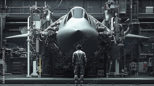 jet, fighter, aircraft, aeroplane, hangar, technician, engineer, futuristic, military, technology, aviation, aerospace, defense, industry, manufacturing, metal, engine, structure, wing, cockpit, pilot, machinery, science, innovation, modern, design, powerful, speed, power, sophisticated, grey, dark, steel, black, white, industrial, construction, man, human, standing, looking, front, ground, background, vertical, perspective