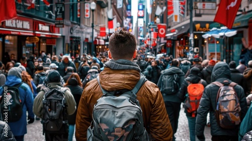 traveler, street, crowd, city, backpack, urban, exploration, adventure, flag, people, colours, public, excitement, capture, vibrant, sightseeing, spirit, journal, observer, social, fill, landscape, movement, culture, journey, essence, ambience, atmosphere, background