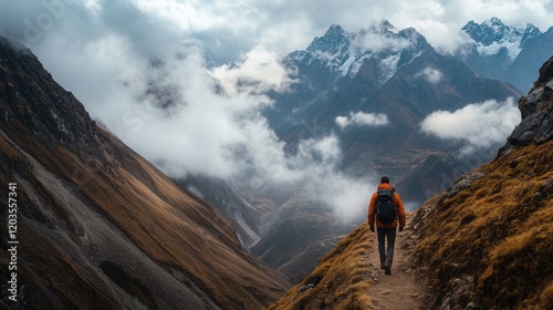 a lone traveler walking along a narrow mountain path, surrounded by dramatic peaks and valleys, with clouds drifting below.