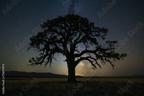 A lone tree is silhouetted against the night sky