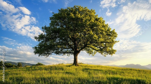 A lone tree stands in a grassy field under a clear blue sky with fluffy white clouds.