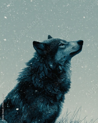 A lone wolf gazes upward as snow falls gently around it in a wintry landscape.