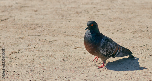 a lonely pigeon walks in the park in clear weather. bird close up.