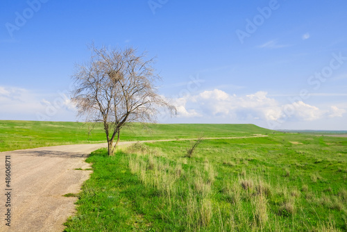 tree, lonely, bright, field, green, bare, road, trail, grass, 1, sky, landscape, nature, spring, blue, meadow, rural, summer, countryside, horizon, beautiful, cloud, season, hill, environment, sunny