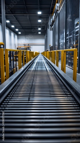 A long conveyor belt in a warehouse, made of steel and yellow metal bars, with a gray grid surface. In the background are modern storage equipment for products such as car parts or electronic devices.
