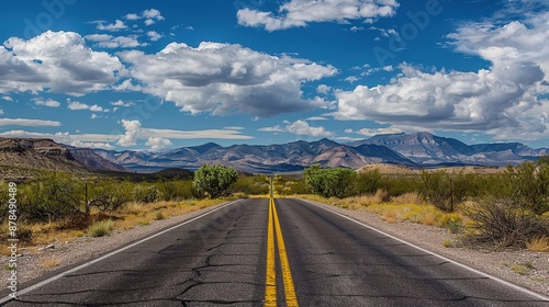 A long, straight road leading towards a mountain range under a blue sky with puffy clouds.