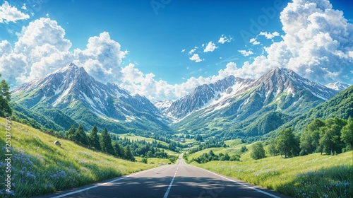 A long straight road stretches into the distance, flanked by lush green fields and rolling hills. Majestic mountains rise behind, creating a stunning backdrop under a bright sky filled with clouds.