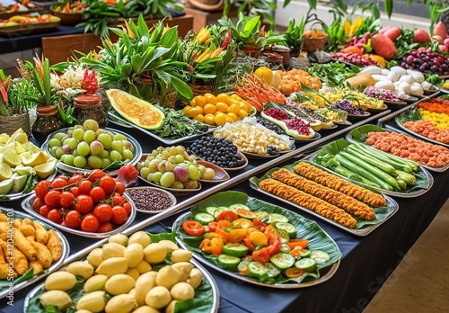 A long table is filled with various types of vegetables, fruits and other healthy foods arranged in platters or bowls on the side.
