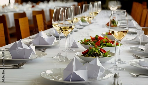 fine dining, table setting, wine glass, salad, gourmet food, special occasion, wedding reception, birthday party
