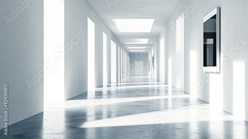 A long, white hallway with a polished concrete floor, sunlight streaming through windows. Minimalist design.