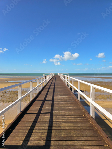pier, breakwater, wood, ocean, beach, sea, bridge, nature, wooden, cloud, horizon, sand, boardwalk, dock, coast, landscape, sky, summer, water, path, travel, coastline, seascape, low tide, tide, australia, queensland
