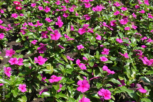 A lot of bright pink flowers of Catharanthus roseus in July