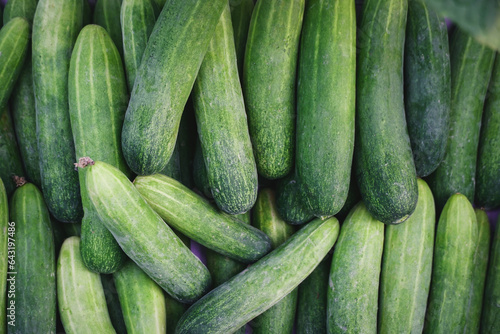 A lots of fresh organic green cucumber on stall in local market, Harvesting from vegetable garden, farmer producer of bio food, Species of food eaten,agriculture,close up,selective focus