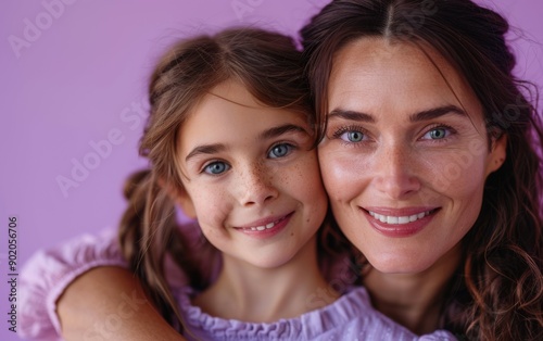 A loving mother and her daughter share a joyful embrace, smiling brightly against a soft purple backdrop, celebrating the special bond they share on Mother’s Day