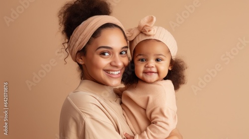 A loving mother smiles, holding her baby against studio background. Generative AI