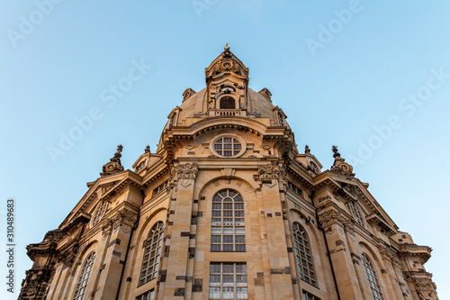A low angle show of the facade of Frauenkirche (Our Ladys church) in Dresden, Germany, just before sunset