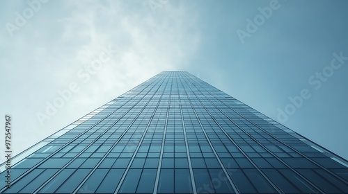 A low angle view of a modern glass skyscraper with a blue sky and light clouds.