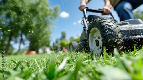 A low-angle shot capturing a person pushing a manual lawnmower, sending grass clippings flying, symbolizing diligent yard work under a sunny sky in a lush garden.