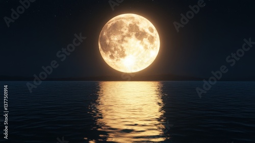 A luminous full moon reflects on a tranquil water surface, creating a serene nighttime atmosphere under a starry sky.