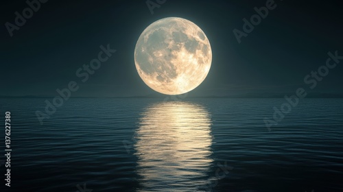 A luminous full moon reflects on calm waters under a dark sky, creating a serene and enchanting nighttime scene.