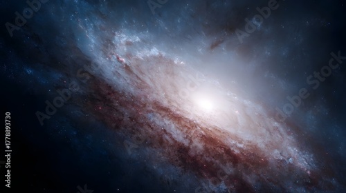 A luminous spiral galaxy with a bright nucleus and swirling cosmic dust in deep space