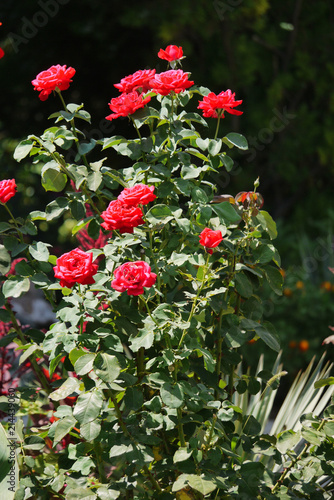 A lush bush of red roses with a lot of green leaves on tall thin stems growing in the garden.