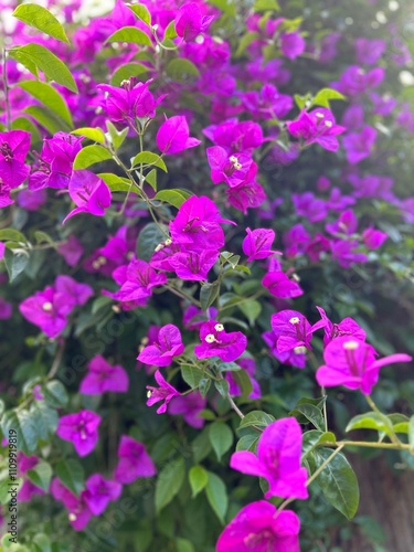 A lush display of vibrant purple bougainvillea flowers, surrounded by green leaves, creating a tropical and colorful backdrop.