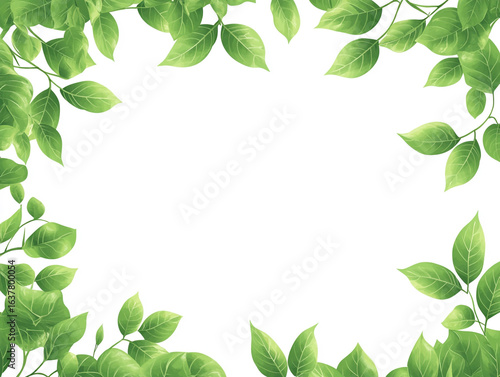 A lush frame of vibrant green leaves creates a border on a clean white background. The leaves are of various sizes and are illuminated by a soft, natural light.