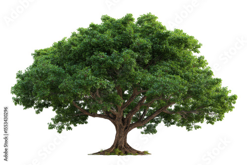 A lush green deciduous tree with a thick trunk and spreading branches isolated on transparent background