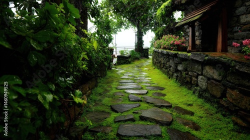 pathway, garden, greenery, stone, moss, serene, escape, lush, peaceful, tranquil, idylli, vibrant, relaxation, shade, inviting, plant, retreat, vine, charme, cosy, rustic, foliage, scenic, backyard, rural, entrance, paseo, tropical, house, haven, floral, leaf, bungalow, outdoors, flower, beauty, nature, environment, natural, fresh, architecture, countryside, landscape