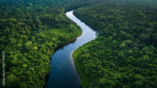 A lush, winding river carves through verdant rainforest, revealing the breathtaking expanse and untouched beauty of the natural world.