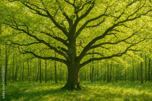 A lush woodland scene featuring a broad-reaching oak tree with fresh spring foliage