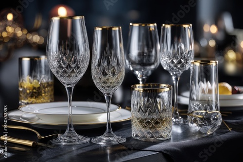 A luxurious and elegant still life featuring crystal glassware with delicate gold trim, capturing the exquisite detail and sophisticated ambiance for a special occasion.