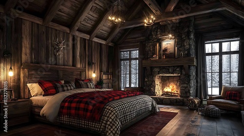 luxurious, cabin, bedchamber, plaid, bedding, neutral, shades, stone, fireplace, rustic, wooden, furniture, soft, ambient, lighting, inviting, cosy, charming, elegant, warm, serene, natural, aesthetic, refined, textured, layered, minimalistic, artistic, aglow, balanced, modern, earthy, bold, peaceful