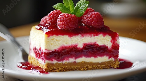 A luxurious cheesecake with a golden graham cracker crust, topped with a raspberry compote and a sprig of mint.