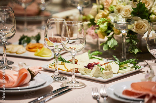 A luxurious covered table for the holiday in an expensive restaurant.