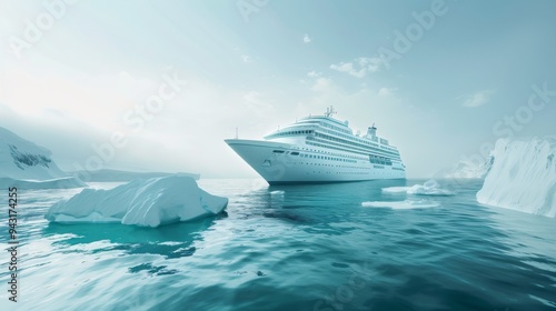 A luxurious cruise ship navigates icy waters, surrounded by serene icebergs under a pale blue sky, reflecting tranquility and adventure.