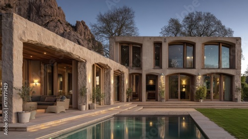 A luxurious desert or mountain residence blends modern and minimalist design, featuring natural stone exteriors,