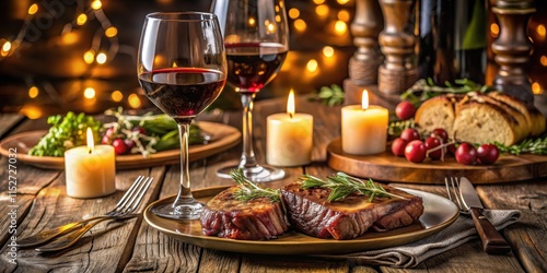 A luxurious dinner setup with a pair of steaks and a glass of red wine on a wooden table, surrounded by soft candlelight and elegant decorations , formal table setting, wine dinner