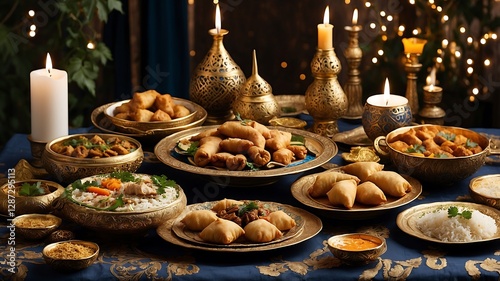 A Luxurious Festive Indian Feast: Golden Dishes and Warm Candlelight