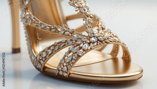 A luxurious gold high-heeled shoe adorned with sparkling crystals