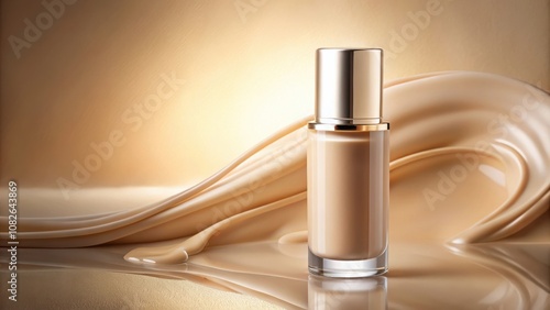 A luxurious golden cap adorns a glass bottle of foundation, set against a backdrop of creamy, swirling liquid, representing the smooth, flawless finish it promises.