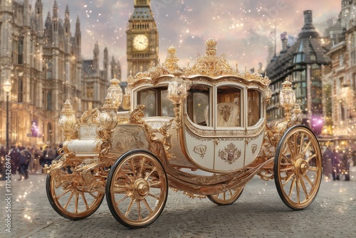A luxurious golden carriage parked in front of London's iconic Big Ben clock tower, offering a regal ride through the historic city streets, glittering with magical lights.