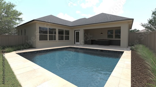 water, pool, swimming, backyard, house, home, exterior, building, design, architecture, roof, wall, sky, blue, clear, landscape, grass, yard, garden, sunny, daytime, modern, tile, patio, deck, stone, light, tree, plant, fence, privacy, view, luxurious, space, open, relaxing, entertainment, living, kitchen, counter, ceiling, window, door, shade, structure, front, back